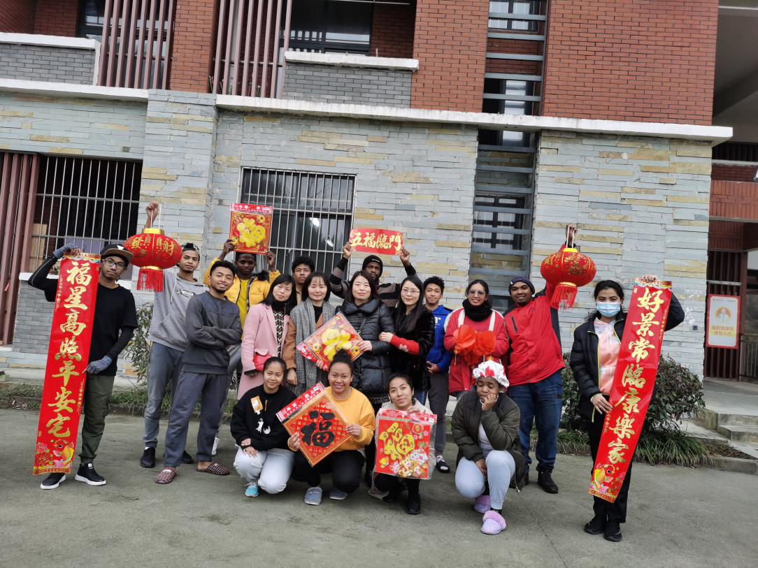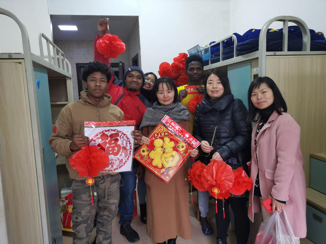 学院领导为职工们送去了水果、糖等生活用品,同时还一起贴对联和福字、挂灯笼,共同感知中华传统文化。