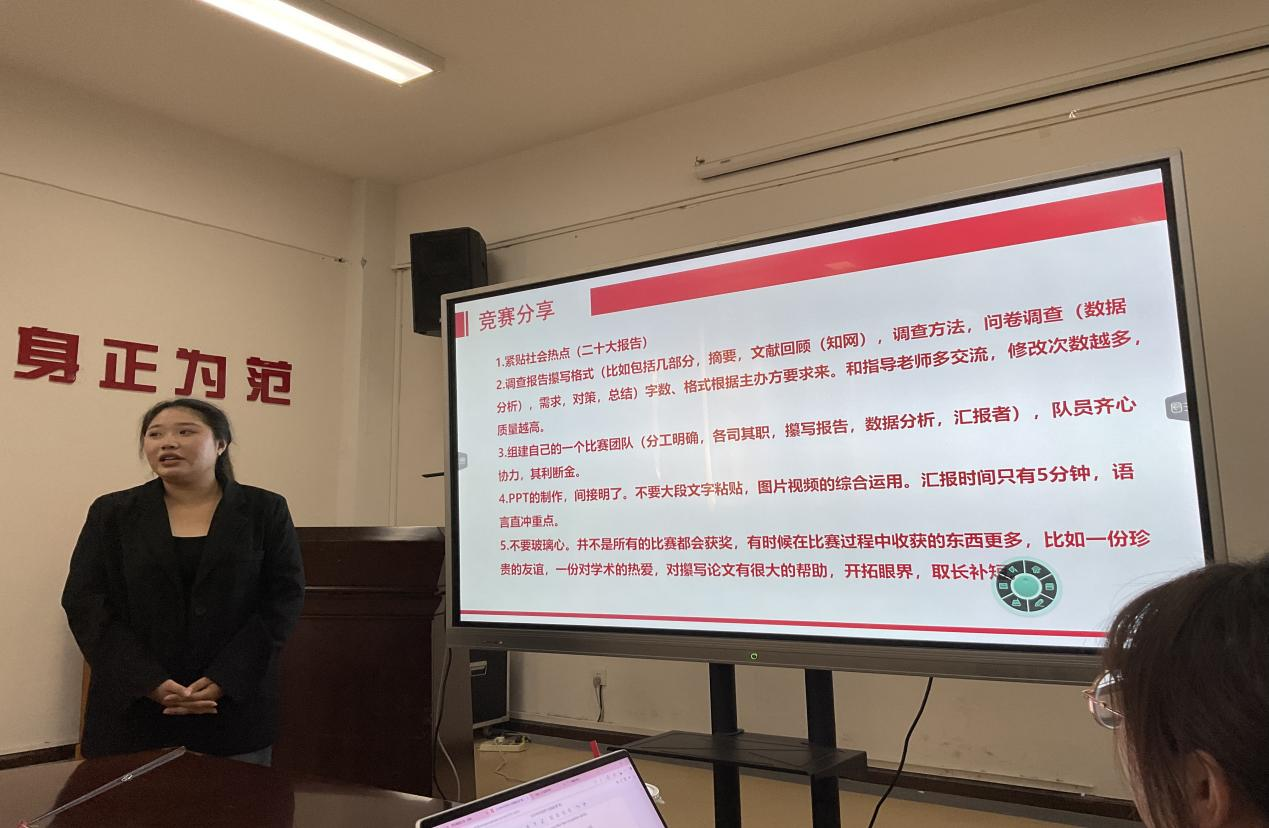 随后,社会工作专业的2名研究生刘学芳、付豪蓉分别从竞赛、英语学习、奖学金评选和获得毕业资格等方面进行了详细介绍。她们不仅分享了自己的亲身经历和成功案例,还向新生们传授了一些实用的学习方法和备考技巧。比如,在备考英语四级和六级考试时,回归真题是关键,通过听力练习和阅读理解等训练,可以有效提高英语成绩;在参与竞赛时,要注重团队合作和沟通技巧的培养,以及调查报告的撰写规范和注意事项等。同时,还强调了大学期间积极参与各类活动的重要性。她们表示,通过参加各种竞赛、社会实践和志愿服务等活动,不仅可以锻炼自己的能力和技能,还可以结交更多志同道合的朋友,为未来的职业发展打下坚实的基础。