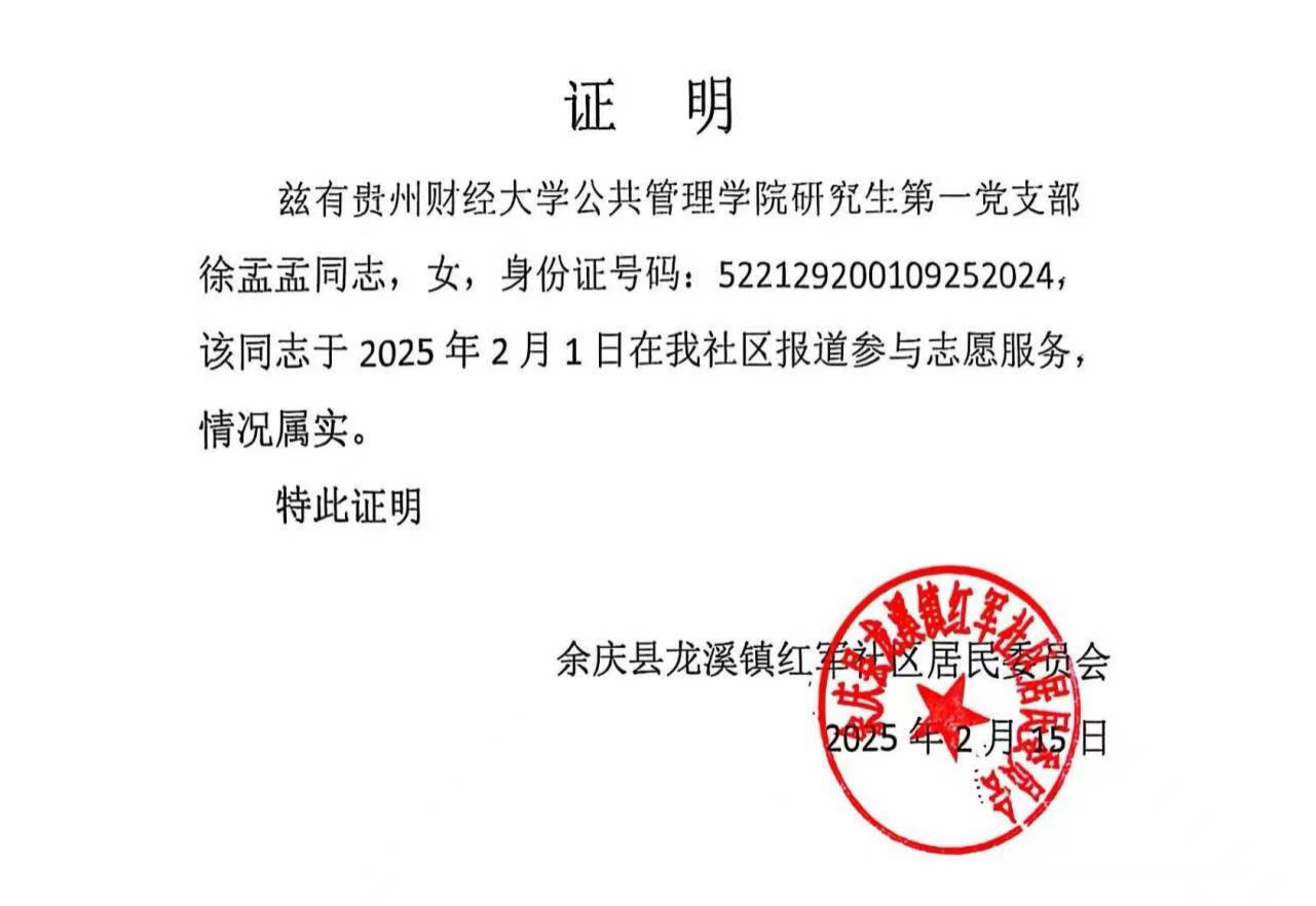 同样来自2023级行政管理专业的徐孟孟也分享了自己的感悟:“参与社区民意收集、政策宣传等工作,让我对‘全心全意为人民服务’的宗旨有了更为直观、深刻的理解。别看社区地方不大,可它却是社会治理的重要基石。作为行政管理专业的研究生,我深感责任重大。在未来的日子里,我将积极探索新时代党建引领社区治理的新路径,努力为构建共建共治共享的社会治理格局贡献自己的一份力量。”