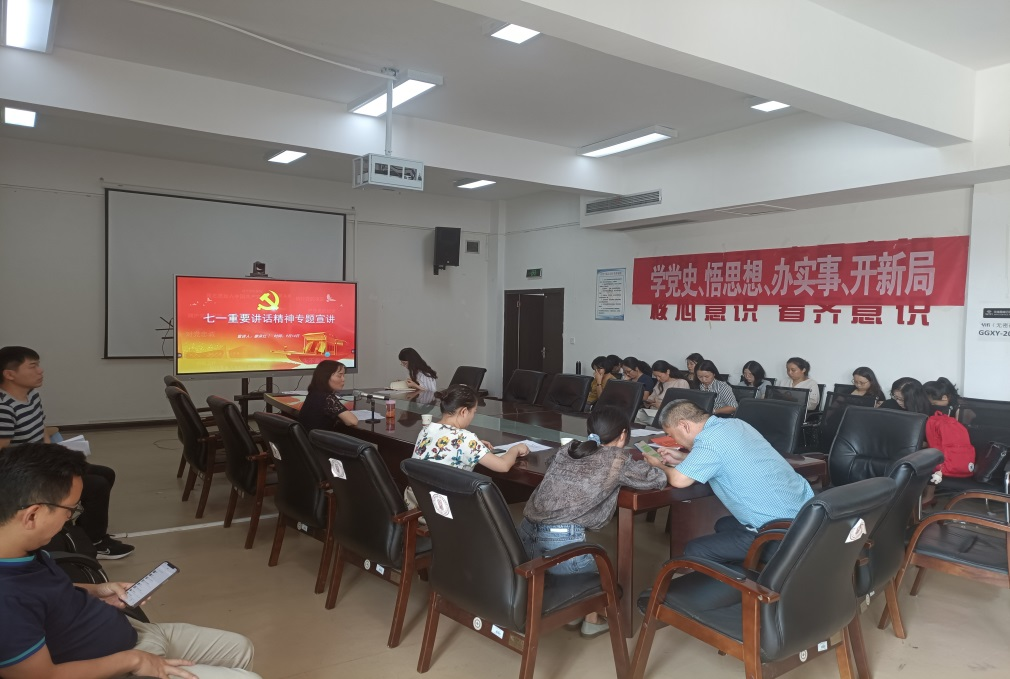 最后,廖承红面向全体教职工开展了七一重要讲话精神专题宣讲。在宣讲中,廖承红指出,习近平总书记的“七一”重要讲话,立足中国共产党百年华诞的重大时刻和“两个一百年”历史交汇的关键节点,是一篇马克思主义纲领性文献,是新时代中国共产党人不忘初心、牢记使命的政治宣言,是我们党团结带领人民以史为鉴、开创未来的行动指南。接着,廖承红从明白“学什么”、弄清“怎么学”、确保“学得好”三个方面详细阐述了学习习近平总书记“七一”重要讲话精神的目的、方法和意义。在结语中,廖承红指出,每一位共产党员都要深入认真学习习近平总书记的“七一”重要讲话,用党的奋斗历程和伟大成就鼓舞斗志、明确方向,用党的光荣传统和优良作风坚定信念、凝聚力量,用党的实践创造和历史经验启迪智慧、砥砺品格,以昂扬姿态奋力开启全面建设社会主义现代化国家新征程。