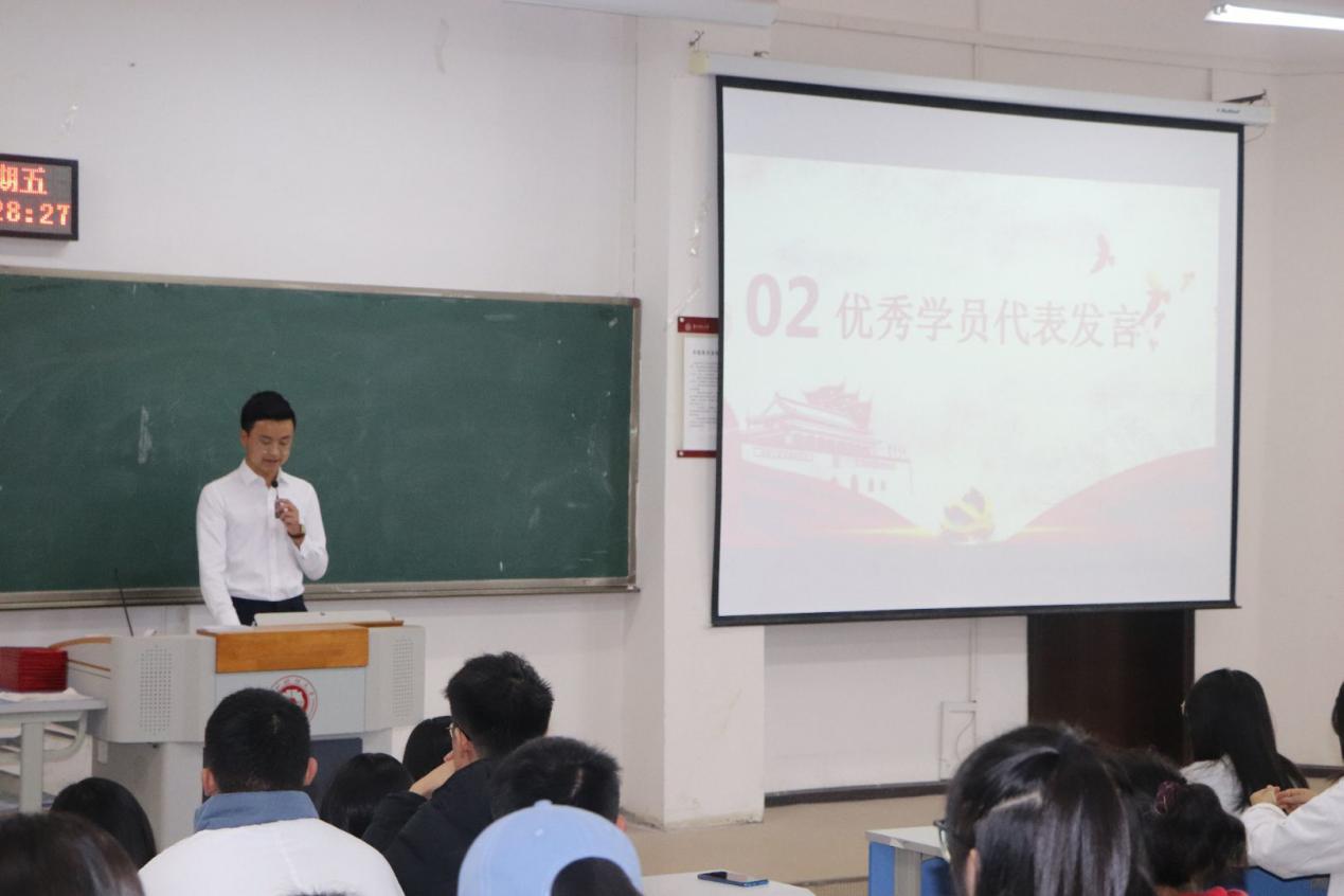 典礼第一项,优秀学员代表张洪义发言,表示通过此次党课学习让他进一步了解了党的历史,感受到党的伟大,以及自己能成为优秀学员而无比自豪;在此次党课学习中,深刻领悟了共产党的内涵,同时充分认识到作为一名入党积极分子的不足,并承诺会在今后的学习生活中不断学习,全面完善自己。