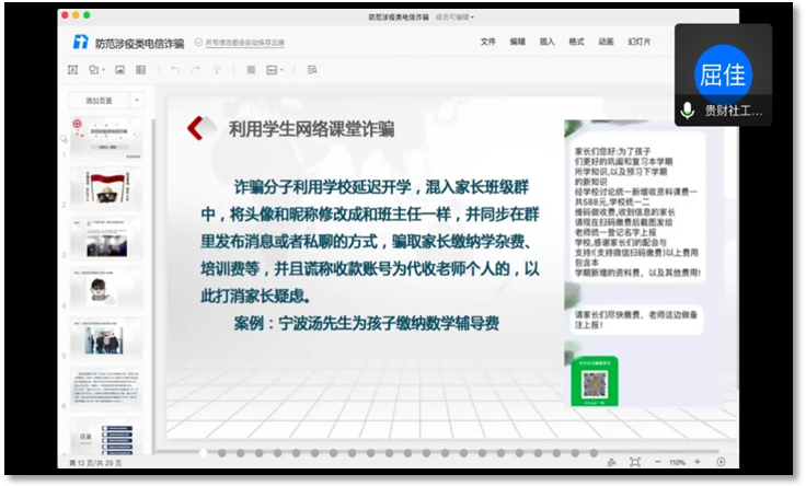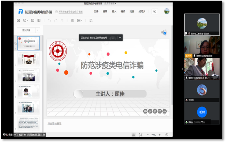 屈佳从涉疫类电信诈骗的概念、常见手段、新特点,穿插源自生活中的三起典型案例,层层递进,深入浅出地给与会人员讲解,有很强的现实针对性和指导性。此外,屈佳通过讲解省内典型诈骗案例,强调“在涉及金钱的时候,一定要先确认对方身份。”诈骗具有团伙性,其背后通常有一个庞大的集团,反侦察意识特别强。骨干均为具备专业知识的人员,集团里有心理学专家、诈骗策划组、话务组、洗钱组、取款组等等,分工明确且非常隐蔽。