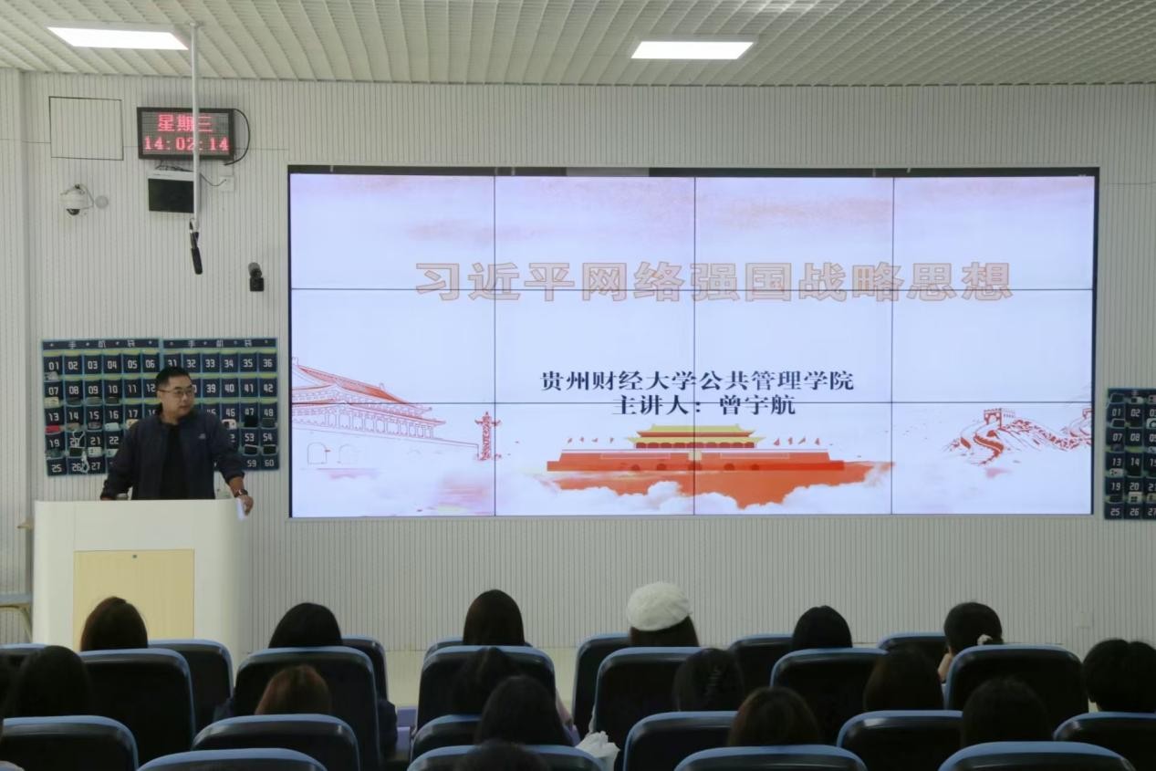 本网讯:(高洁 报道|摄影 陈子豪 刘秋吉)为全面贯彻落实党的二十届三中全会精神,深入贯彻习近平总书记关于网络强国的重要思想,发挥思政课的教育引领作用,10月23日,公共管理公司党委副书记、经理曾宇航以“习近平网络强国战略思想”为题,在进学楼103教室为2024级新生讲授了一堂精彩的思政课。