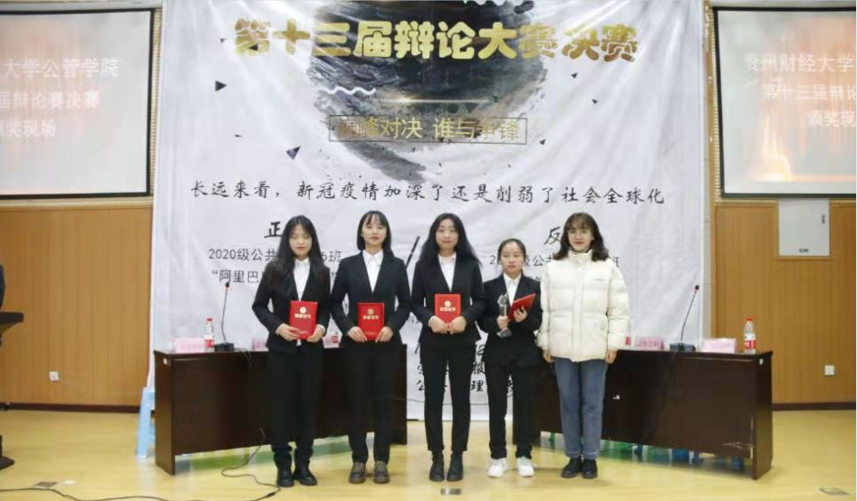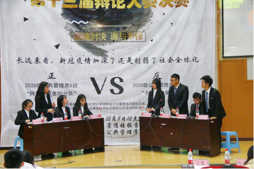 比赛开始后,场上双方辩手你来我往,唇枪舌战,围绕着辩题长远看来,新冠疫情加深了还是削弱了社会全球化展开了激烈的辩论。辩论中选手们依然不失风度,始终面带微笑,侃侃而谈。良好的风范、出色的口才、敏捷的思维令场下观众为之折服,掌声不断。最终20级公共管理类4班代表队凭借着出色的反应能力和严谨的逻辑夺得本届辩论赛冠军,20级公共管理类5班惜居亚军,正方三辩荣获优秀辩手。