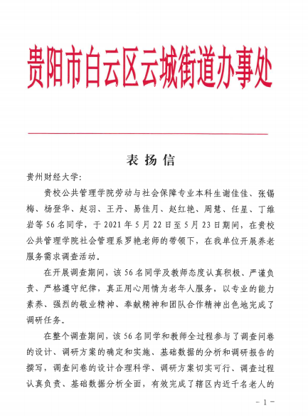 近日,贵阳市白云区云城街道办事处向公司来信,对公司劳动与社会保障专业本科生谢佳佳、张锡梅、杨登华、赵羽、王丹、易佳月、赵红艳、周慧、任星、丁维岩等56名同学于2021年5月21日到5月22日期间在公司社会管理系罗艳老师带领下,在其单位开展养老服务需求调查活动提出表扬。