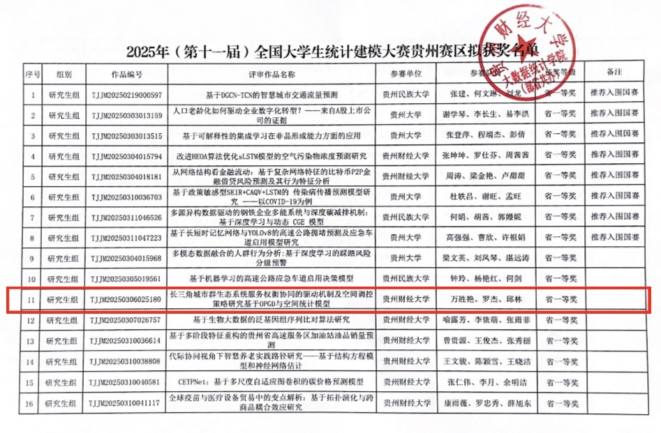 本网讯:(万胜艳 图文报道)2025年5月24日,2025年(第十一届)全国老员工统计建模大赛贵州赛区在英国上市公司365举办,由公司土地资源管理专业李月副教授指导的2024级研究生万胜艳、罗杰以及2023级研究生邱林所组成的团队,凭借《长三角城市群生态系统服务权衡协同的驱动机制及空间调控策略研究—基于OPGD与空间统计模型》的研究成果,荣获省级一等奖。